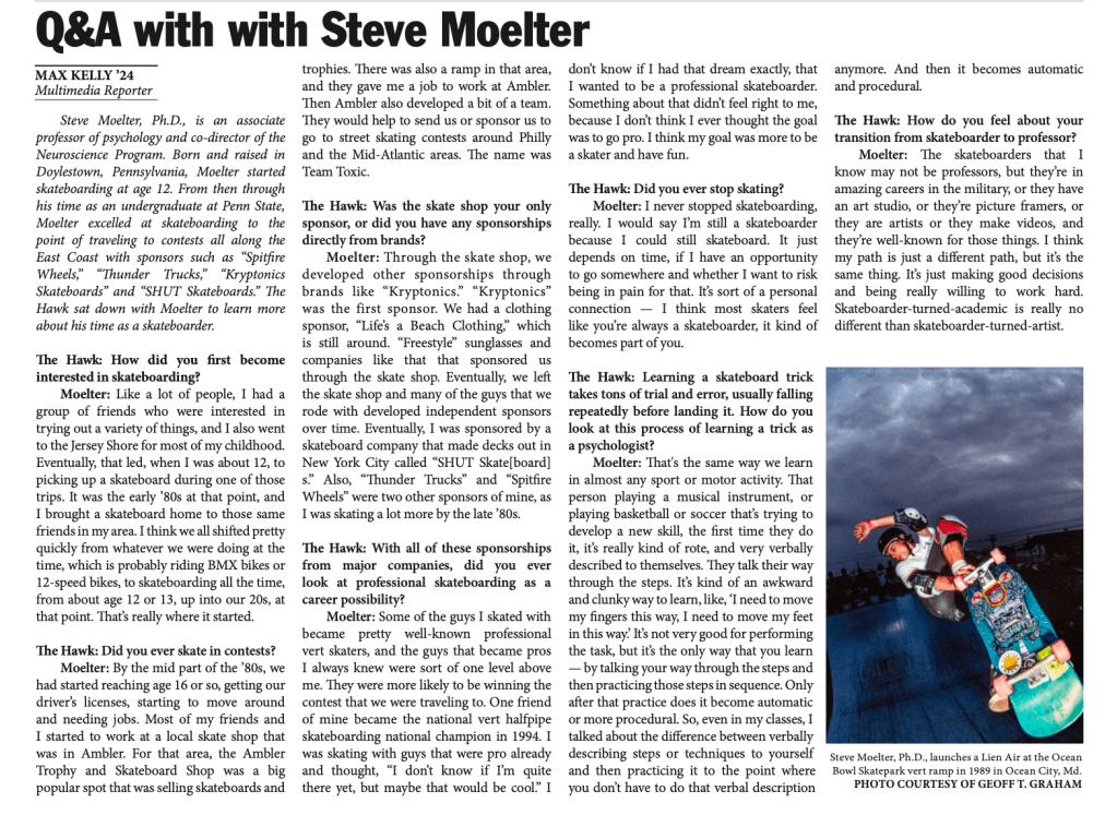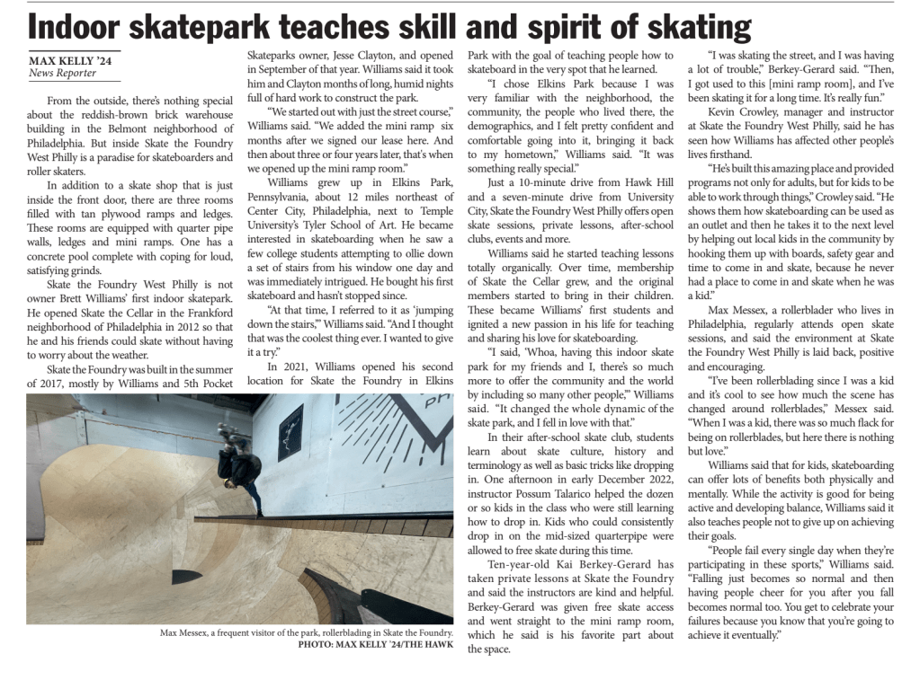 I wrote news and feature stories for the Hawk Student Newspaper beginning my sophomore year, learning skills of research, interviewing, objective writing using AP style, adaptability, fast turnover rates, and shooting photos using DSLR and mirrorless cameras.